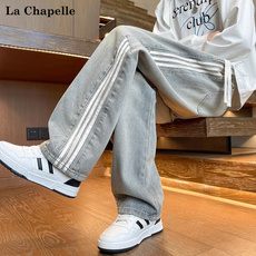拉夏贝尔加长加绒条纹抽绳牛仔裤2025男女秋冬潮流休闲宽松直筒裤
