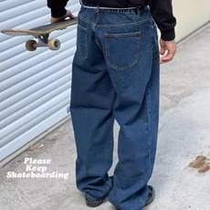 中高腰加长复古宽松牛仔长裤街舞滑板直筒水洗牛仔裤男款蓝色黑色