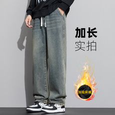 115CM加长加绒加厚复古牛仔裤男款高个子青少年冬天直筒男生裤子