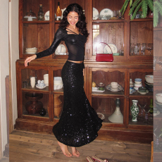 气质流行波点半身裙女2025秋冬新款松紧弹力高腰金丝绒包臀鱼尾裙