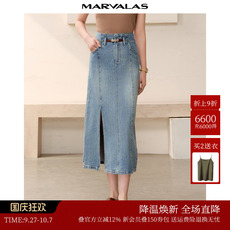 曼德诗牛仔半身裙2025秋季新款全棉复古裙摆高开叉设计包臀长裙女