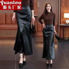 春季女装皮裙子复古高腰包臀皮裙超长款侧开叉半身裙pu皮半身长裙