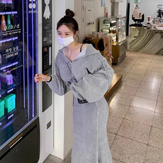 荡领五分袖设计感围脖针织衫针织包臀裙半身裙松紧腰长裙两件套女