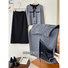 韩系灰色波点毛呢半身裙女秋冬梨形身材直筒裙后开衩中长款a字裙