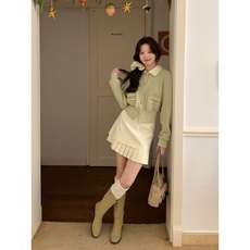 秋冬新款大码胖妹妹显瘦遮肉韩系复古格子毛呢半身裙针织开衫套装