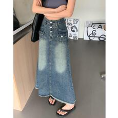 港风复古高腰a字裙春夏款年新款中长款半身裙女毛边牛仔裙子定制