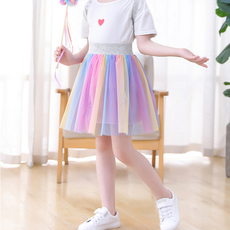 女童半身裙儿童网纱蓬蓬短裙薄款表演舞蹈裙渐变七彩色公主百褶裙