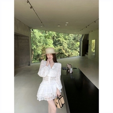 小个子高腰白色蕾丝花边A字半身裙套装蓬蓬蛋糕短裙配外套两件套