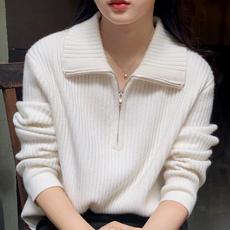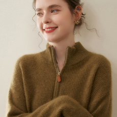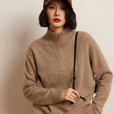 2025年新款山羊绒衫女翻领拉链针织开衫半高领宽松毛衣外套上衣