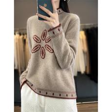半高领新款100%纯羊绒衫女毛衣套头秋冬宽松洋气妈妈装绣花打底衫