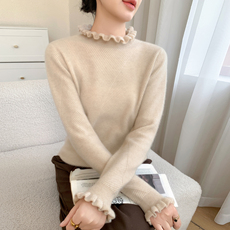 2025冬季新款山羊绒衫女半高领木耳边拼色针织衫高级感打底衫毛衣