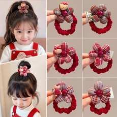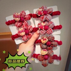 (儿童新年红色花朵发绳)甜美卡通发圈女童格子头饰不伤发皮筋