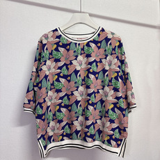 新款气质甜美印花荷叶边圆领卫衣宽松显瘦圆领半袖别致上衣女衬衫