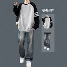 春秋冬季圆领卫衣套装男生休闲青少年潮流帅气男装一套搭配牛仔裤