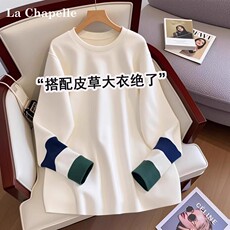 拉夏贝尔假两件圆领加绒打底衫女秋冬中长款卫衣配鲨鱼裤的上衣