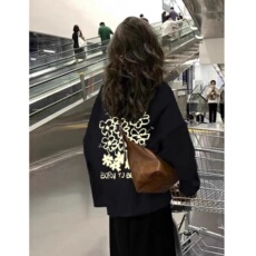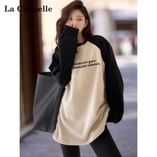 拉夏贝尔印花圆领加绒打底衫女秋季宽松中长款卫衣配鲨鱼裤的上衣
