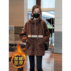 2025年秋冬季新加绒加厚豹纹连帽卫衣女今年流行的漂亮设计感外套