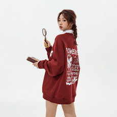 HONRN/红人宽松红色短款无帽圆领套头卫衣上衣女春秋款HI11SY203