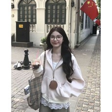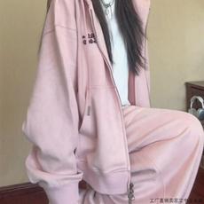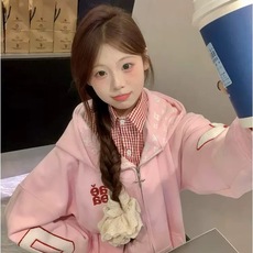 美式复古撞色设计连帽卫衣女韩系休闲宽松慵懒风粉色长袖开衫外套
