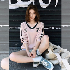 美式复古粉色宽松v领印花长袖卫衣女设计感甜辣妹休闲上衣早秋款