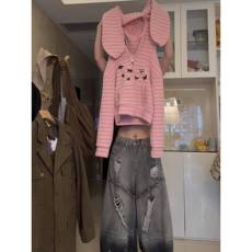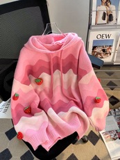 复古粉色条纹甜美印花连帽卫衣女秋季2025新款慵懒风宽松开衫外套