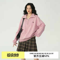 omont蛋挞家 粉色拉链polo领卫衣女冬季新款复古宽松加绒上衣