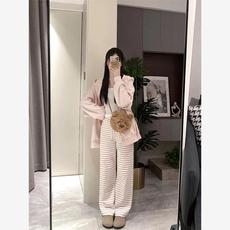 韩系巨好看粉色细条纹连帽卫衣开衫长袖女装早秋穿搭宽松外套上衣