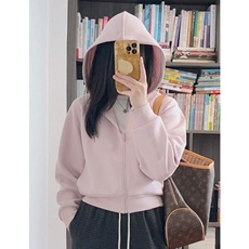 粉色短款重磅卫衣女秋冬季2025新款拉链开衫加绒加厚连帽宽松外套