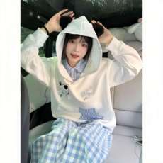 甜美可爱猫咪刺绣假两件连帽白色粉色卫衣女慵懒宽松春秋新款上衣
