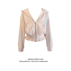 粉色甜美风木耳边拉链连帽开衫外套卫衣女秋新款宽松洋气百搭上衣