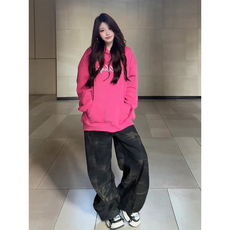 2025美式复古粉色连帽卫衣女秋冬新款宽松慵懒风oversize外套上衣