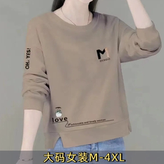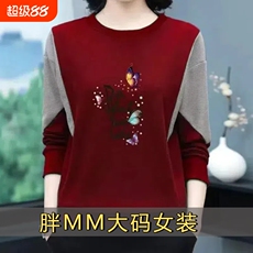 100%纯棉清仓捡漏~大码中年圆领卫衣女春秋印花拼接长袖打底衫潮Q
