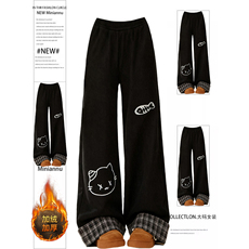大码胖mm可爱卡通印花阔腿卫裤女秋冬学院风显瘦加绒加厚绝美裤子