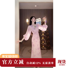 茗思雪纺印花长袖连衣裙2025秋季新款气质高档木耳领减龄显瘦裙子