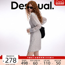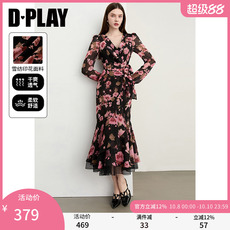 DPLAY2025年秋季新款黑色连衣裙女长款气质法式长袖雪纺印花裙子
