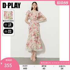 DPLAY2025年夏季新款粉色印花度假连衣裙女法式雪纺裙子茶歇长裙