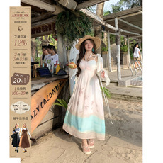 安妮不火 海岛印花雪纺连衣裙女2025春夏新款微胖大码渡假吊带裙