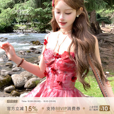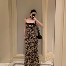 Acaine梅子冰茶/红色中长款印花雪纺吊带连衣裙女夏法式收腰裙子