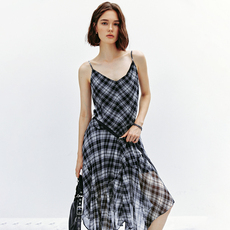 【朋克复兴】顺纡绉雪纺 新款系腰带V领不规则格纹印花吊带连衣裙