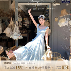 DPLAY2025夏季气质蓝色连衣裙女印花泡泡袖雪纺海边沙滩裙长裙