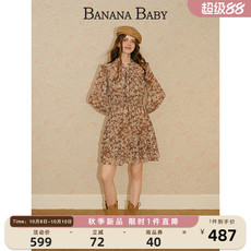 新品-BANANA BABY2025年冬季新款印花雪纺连衣裙女系带灯笼袖短裙