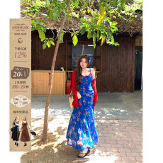 安妮不火 蓝礁红槿印花v领鱼尾雪纺吊带裙微胖大码收腰碎花连衣裙
