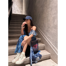 Acaine蓝色长款雪纺印花小飞袖吊带连衣裙女夏季法式甜美显瘦裙子