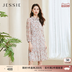 JESSIE复古印花连衣裙秋季新款单排扣褶皱收腰显瘦雪纺连衣裙女款