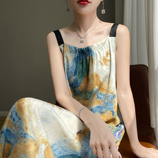 韩版宽松慵懒风雪纺缎面吊带连衣裙印花醋酸吊带裙旅游背心裙海边