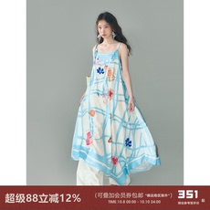 麦叙原创《南岛花季》法式海岛度假风蓝色碎花雪纺吊带连衣裙长裙