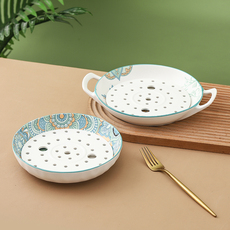 双耳饺子盘带蒸片沥水沥油海鲜虾盘陶瓷双层家用菜盘多功能蒸盘子