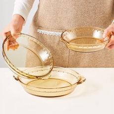 百思福高硼硅玻璃耐热茶色双耳玻璃盘圆型盘子微波炉烤盘加大加厚