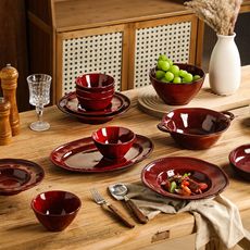 窑变餐具碗盘套装新款复古釉下彩饭碗陶瓷盘子菜盘家用双耳汤碗盘
