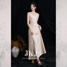 GV大白哥 闪闪白茶 烫银荡领吊带缎面连衣裙优雅风礼服法式长裙女